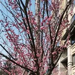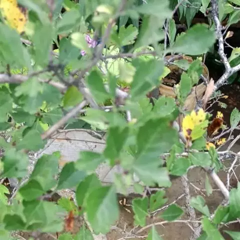 山里红 落叶乔木,植株生长茂盛。高达6米,树皮粗糙,暗灰色或灰褐色;刺长约1-2厘米,有时无刺;小枝圆柱形,当年生枝紫褐色,无毛或近于无毛,疏生皮孔,老枝灰褐色;冬芽三角卵形,先端圆钝,无毛,紫色。