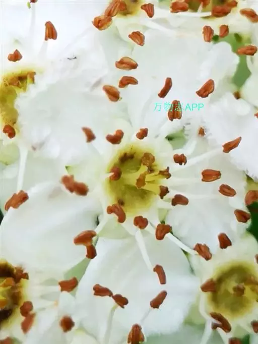 伞房花序具多花,直径4-6厘米,总花梗和花梗均被柔毛,花后脱落,减少,花梗长4-7毫米;苞片膜质,线状披针形,长约6-8毫米,先端渐尖,边缘具腺齿,早落;花直径约1.5厘米;萼筒钟状,长4-5毫米,外面密被灰白色柔毛;萼片三角卵形至披针形,先端渐尖,全缘,约与萼筒等长,内外两面均无毛,或在内面顶端有髯毛;花瓣倒卵形或近圆形,长7-8毫米,宽5-6毫米,白色;雄蕊20,短于花瓣,花药粉红色;花柱3-5,基部被柔毛,柱头头状。