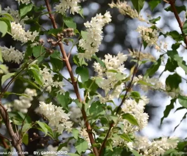灌木,高约2m;老枝紫褐色或灰褐色,无毛,表皮片状脱落;花枝开始极短,以后延长达4cm,具2~4叶,黄褐色,被具中央长辐线星状毛。叶纸质,卵状菱形或椭圆状卵形,长2~5.5cm,宽1~3.5cm,先端急尖,基部楔形或阔楔形,边缘具大小相间或不整齐锯齿,上面被4~6辐线星状毛,下面灰白色,被7~11辐线星状毛,毛稍紧贴,沿叶脉具中央长辐线,侧脉每边5~6条;叶柄长1~4mm,被星状毛。