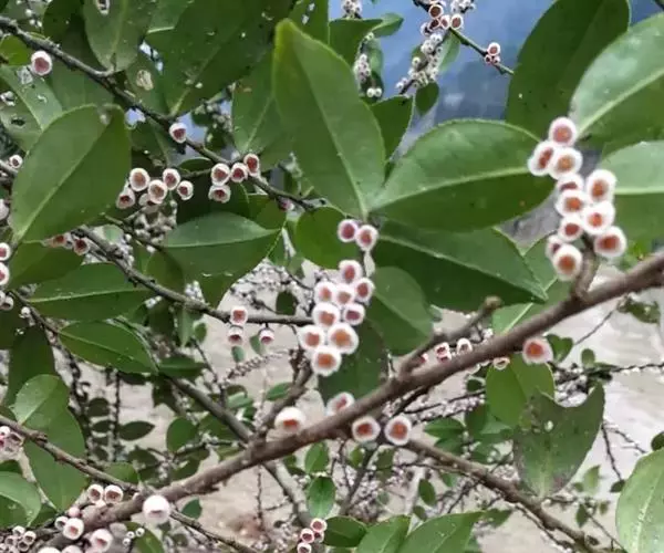 格药柃秋冬开花,具微香,浆果为球形,密集于枝干,十分可爱,是观花观果植物。