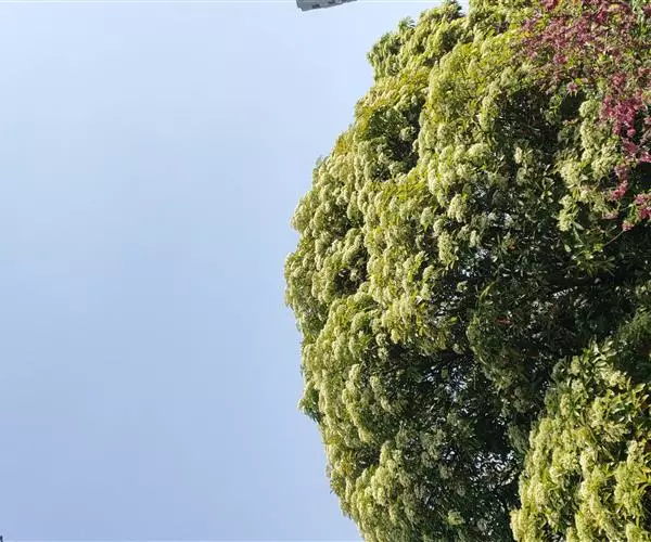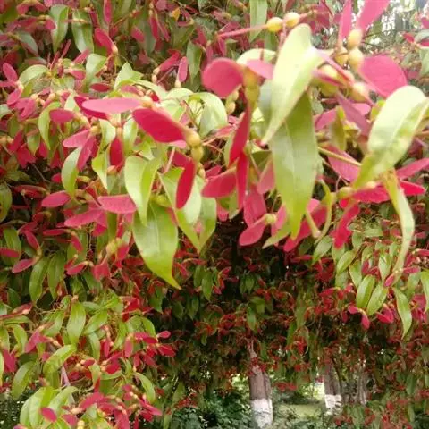 花杂性,雄花与两性花同株,常成密被淡黄色长柔毛长5 6厘米的伞房花序,总花梗长1-2厘米;萼片5,淡绿色,长圆形或长倒卵形,长3-3.2毫米,宽1.5-1.8毫米,外侧被长柔毛;花瓣5,淡黄色,披针形或倒披针形,长3.3-4毫米,宽1-1.2毫米,先端微凹缺;雄蕊8,略短于萼片;花盘无毛,位于雄蕊的外侧;子房紫色,被淡黄色长柔毛,花柱很短;花梗细瘦,被淡黄色长柔毛。翅果嫩时紫色,成熟后现黄褐色;