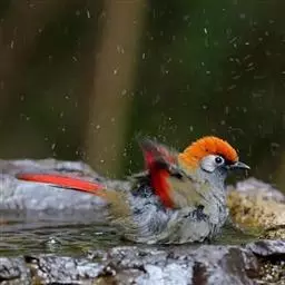 栗耳凤鹛,雌雄羽色相似。额、头顶至枕灰色,头顶有一短的不甚明显的羽冠,…