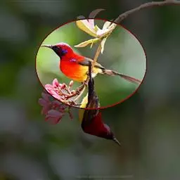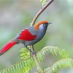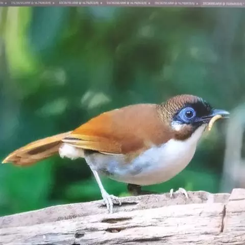 赤尾噪鹛中型鸟类,体长24~28厘米。头顶至后颈红棕色,两翅和尾鲜红色,眼先、眉纹、颊、颏和喉黑色,…
