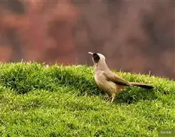 玉山噪鹛中等体型的褐色鸟类。白色长眉纹及髭纹显著;顶冠灰而具白色的鳞状斑纹;脸侧及颏褐色,…