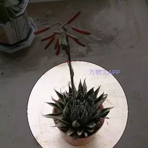 为多年生肉质草本。莲座叶盘径20厘米 波路 左右,叶片多达40-50片,排列紧凑。叶深绿色,叶尖稍红,三角形带尖,叶长7-8厘米,基部宽3厘米,叶背上部有2条龙骨突,布满白齿状小硬疣。叶背面下部有1条龙骨突,截面呈三角形,叶缘也布满白色小疣。花序高,花基部红色,先端绿色似鲨鱼掌。