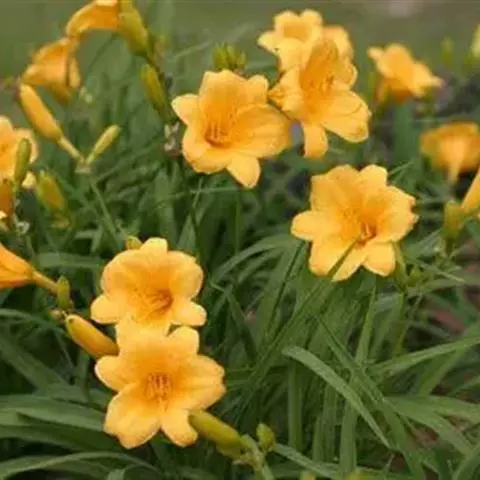 金娃娃萱草:是萱草的人工栽培的园艺品种。地下具根状茎和肉质肥大的纺锤状块根。叶基生,条形,排成两列,…