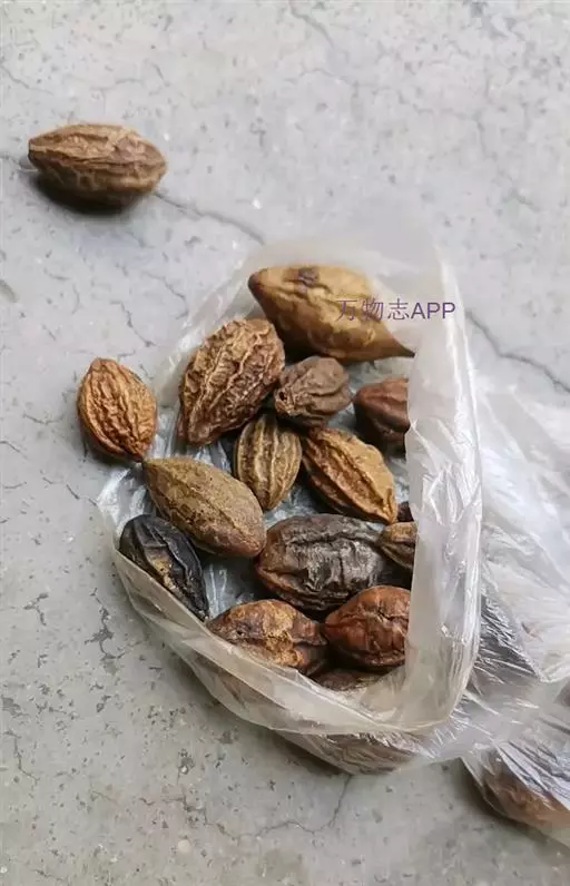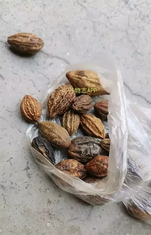 药材性状:为长圆形或卵圆形,长2-4cm,直径2-2.5cm。表面黄棕色或暗棕色,略具光泽,有5-6条纵棱线和不规则的皱纹,基部有圆形果梗痕。质坚实。果肉厚0.2-0. 4cm,黄棕色或黄褐色。果核长1.5-2.5cm,直径1-1.5cm,浅黄色,粗糙,坚硬。种子狭长纺锤形,长约1cm,直径0. 2-0. 4cm,种皮黄棕色,子叶2,白色,相互重叠卷旋。气微,味酸涩后甜。