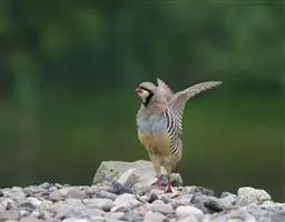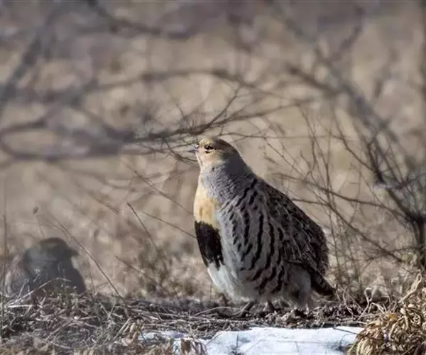 斑翅山鹑(学名:Perdix dauurica)体长250-310毫米,是体形略小的灰褐色鹑类。雄鸟的脸、喉中部及腹部桔黄色,腹中部有一倒"U"字形黑色斑块。与灰山鹑的区别在于胸为黑色而非栗色,喉部桔黄色延至腹部,喉部有羽须。雌鸟胸部无橘黄色及黑色,但有"羽须"。栖息于平原森林草原、灌丛草地、低山丘陵和农田荒地等各类生境中。以植物性食物为食,包括灌木和草本植物的嫩叶、嫩芽、浆果、草杆等,也吃蝗虫、蚱蜢等昆虫和小型无脊推动物。分布于俄罗斯的西伯利亚、乌苏里、蒙古和中国东北、华北和西北等北方大部分地区。