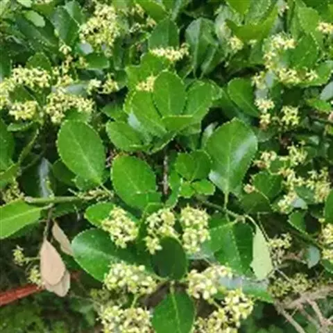 常绿灌木或小乔木,高达8米。 叶光亮革质,倒卵形或窄长椭圆形,长3-6厘米,宽2-3厘米。 聚伞花…