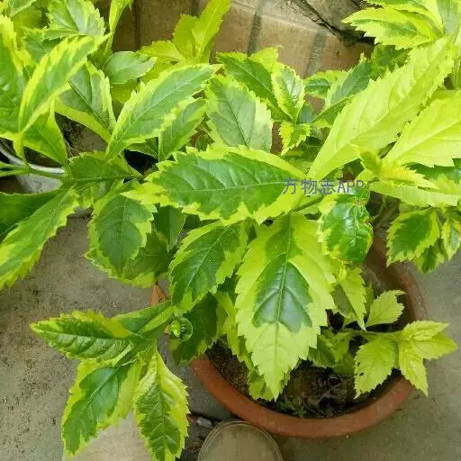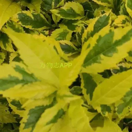 金叶假连翘(Duranta repens ‘Variegata’),常绿灌木,株高0.2-0.6米,枝下垂或平展。叶对生,叶长卵圆形,色金黄至黄绿,卵椭圆形或倒卵形,长2—6.5厘米,中部以上有粗齿。花蓝色或淡蓝紫色,总状花序呈圆锥状,花期5-10月。核果橙黄色,有光泽。原产墨西哥至巴西,中国南方广为栽培,华中和华北地区多为盆栽。
