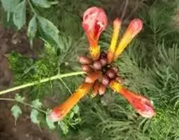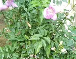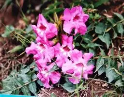 粉花凌霄 K.Schum.)是紫葳科魔盒凌霄属的落叶藤本植物。奇数羽状复叶对生,小叶全缘,…