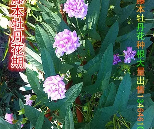 藤本牡丹花期长,一节脚芽生长成形的植株,藤蔓冠幅达一米多,盛花期日开花量近百朵,如色彩斑斓的挂毯,壮丽美观,微风拂动又如群蝶翩飞,是花篱、花棚、花廊的好制材,还可以地爬式彩花通道和彩花地坪,是多种形式绿化的佳品。