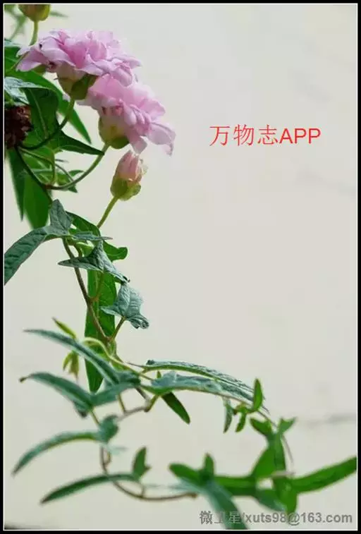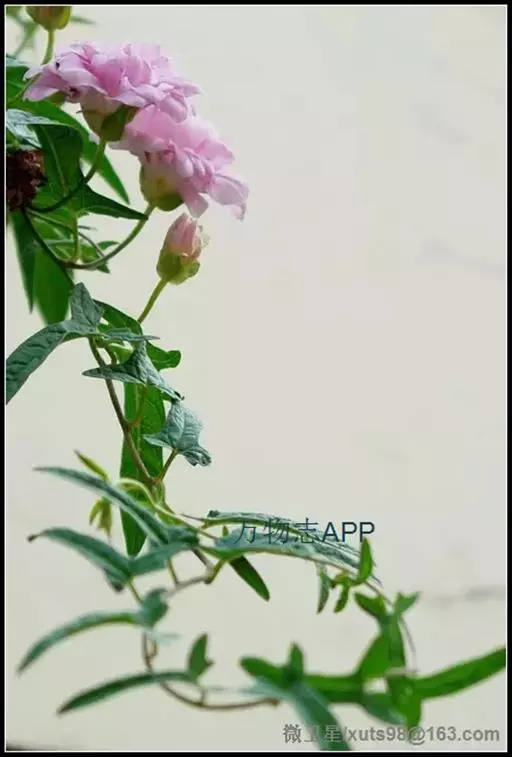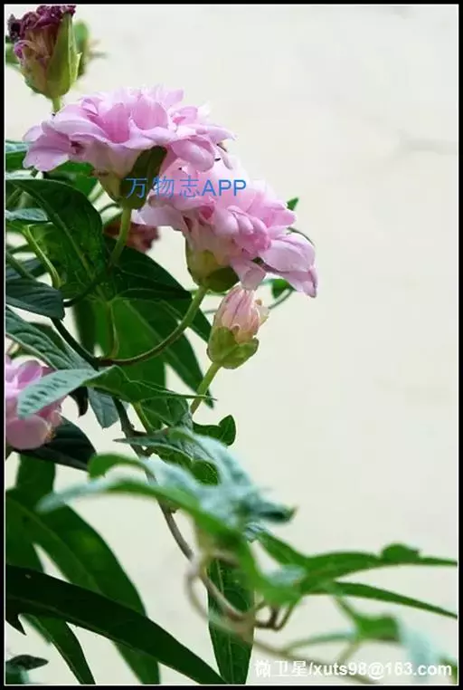 茎左旋缠绕,,主蔓粗度可达0.3cm~0.4cm,分枝可达5~7个,枝节长2cm~3cm,单叶互生,叶柄长2cm~3cm,叶长6cm~8cm,宽1.5cm,全缘。叶基部向两侧派生出1.5~2cm长片连体叶,小叶茎部微呈两裂,植物学称戟形叶。花柄长5cm~8cm,莲花形花座花形似牡丹,花粉色,重瓣( 40~50个花瓣)撕裂状,形状不规则,花瓣裂片向内变狭,没有雄蕊和雌蕊。花色艳丽,叶形美观。当年可长高达4m~5m, 当年栽植当年开花, 一节一花, 每花开放达3 天, 最盛时每株可日开花近百朵,6 月中旬始花, 直至上冻时蔓上仍有许多花蕾。
