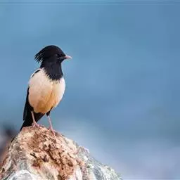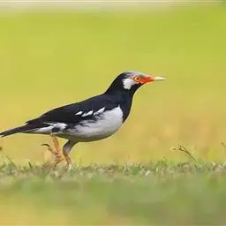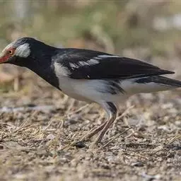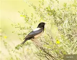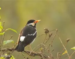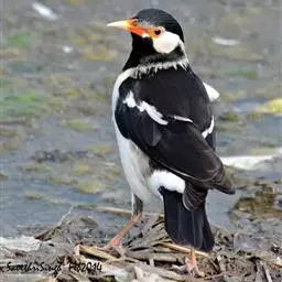斑椋鸟:是中等体型的黑白色椋鸟,体长24厘米。头顶、头侧、翼斑、腰及腹部白色,喉、胸及上体余部黑色,…