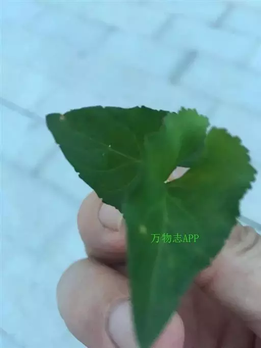 叶均基生,呈莲座状;叶片三角形、三角状卵形或戟形,长1.5-7厘米,宽1-3.5厘米,最宽处在叶的基部,中部向上渐变狭,先端渐尖或尖,基部宽心形,弯缺呈宽半圆形,两侧垂片发达,通常平展,稍下延于叶柄成狭翅,边缘具圆锯齿,两面通常无毛,少有在下面的叶脉及近基部的叶缘上有短毛,上面密生乳头状小白点,但在较老的叶上则变成暗绿色;叶柄无毛,长2-7厘米;托叶3/4与叶柄合生,分离部分披针形,长3-5毫米,先端渐尖,边缘疏生流苏状短齿,稀全缘,通常有褐色锈点。