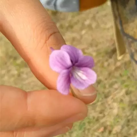 花淡紫色,有暗色条纹;花梗细弱,通常与叶片等长或稍高出于叶,无毛或上部被柔毛,中部稍上处有2枚线形小苞片;萼片卵状披针形或披针形,长4-7毫米,顶端渐尖,基部附属物伸长,长2-3毫米,末端具缺刻状浅齿,具狭膜质缘,无毛或具纤毛;花瓣长圆状倒卵形,长7-9毫米,侧方花瓣里面基部有须毛,下方花瓣连距长10-12毫米;距管状,长2.5-3毫米,直,末端钝;下方雄蕊背部的距角状,长约2.5毫米,顶端尖,基部宽;子房球形,无毛,花柱棍棒状,长约2毫米,基部稍膝曲,顶端平,两侧具较宽的缘边,前方具明显的短喙,喙端具向上开口的柱头孔。