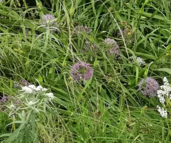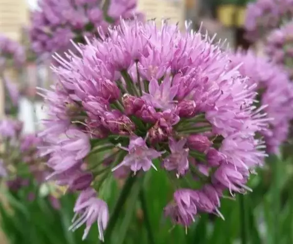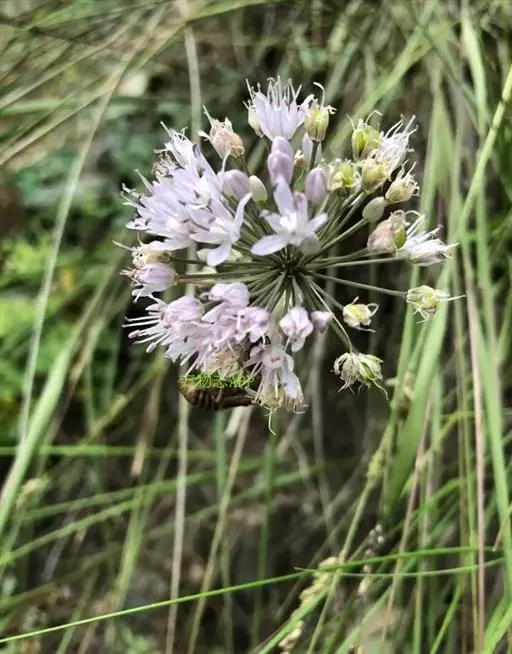 花葶圆柱状,高30-70厘米,1/4~1/3被叶鞘;总苞2裂,比花序短;伞形花序半球状至球状,具多而密集的花,或间具珠芽或有时全为珠芽;小花梗近等长,比花被片长3~5倍,基部具小苞片;珠芽暗紫色,基部亦具小苞片;花淡紫色或淡红色;花被片矩圆状卵形至矩圆状披针形,长4~5.5毫米,宽1.2~2毫米,内轮的常较狭;花丝等长,比花被片稍长直到比其长1/3,在基部合、生并与花被片贴生,分离部分的基部呈狭三角形扩大,向上收狭成锥形,内轮的基部约为外轮基部宽的1.5倍;子房近球状,腹缝线基部具有帘的凹陷蜜穴;花柱伸出花被外。花果期5~7月。