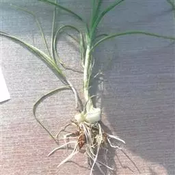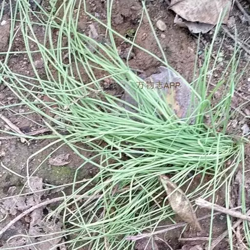 鳞茎近球状,粗0.7~1.5(-2)厘米,基部常具小鳞茎(因其易脱落故在标本上不常见);鳞茎外皮带黑色,纸质或膜质,不破裂,但在标本上多因脱落而仅存白色的内皮。叶3~5枚,半圆柱状,或因背部纵棱发达而为三棱状半圆柱形,中空,上面具沟槽,比花葶短。