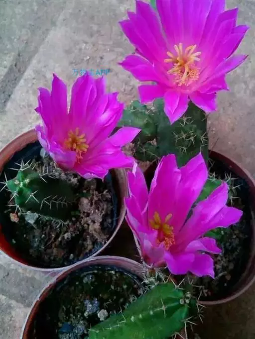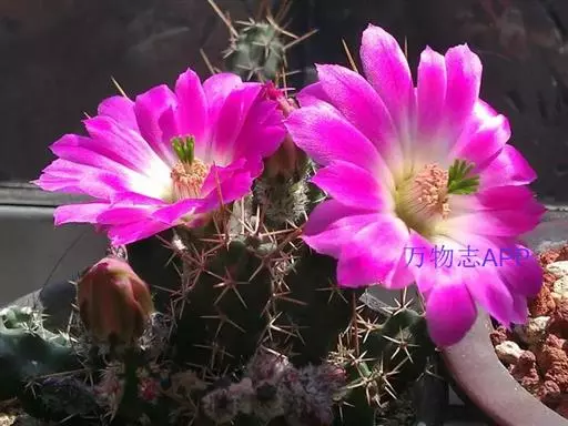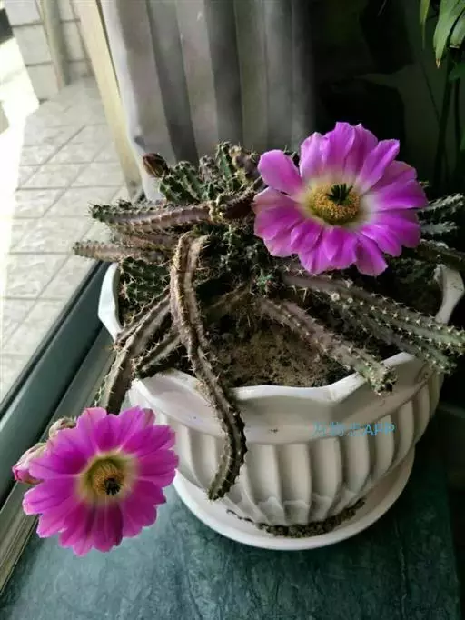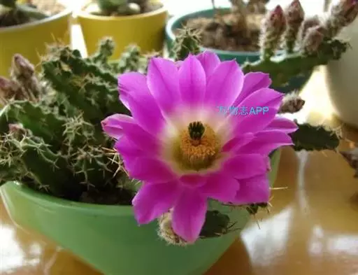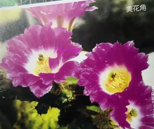 美花角植株有点大,有5-6棱,球体绿色,长柱型,基本五角型,刺生疣凸角尖上,有黄白色刺4-5枚。春、夏季节开花。美花角花开粉色或玫红色,叶片有绢质感,花有雌蕊1枚,雄蕊多枚,黄色。异花授粉。美花角配土比较简单,珍珠岩混合了泥炭,加了蛭石和煤渣,比例随意,透气为主,土表铺设了浮石。美花角这个品种还是比较耐暴晒的,生长期干透给水,成株尽量少点水,不然就容易徒长的很长哦,群生美花角长的都比较高,光照不够也容易长高。