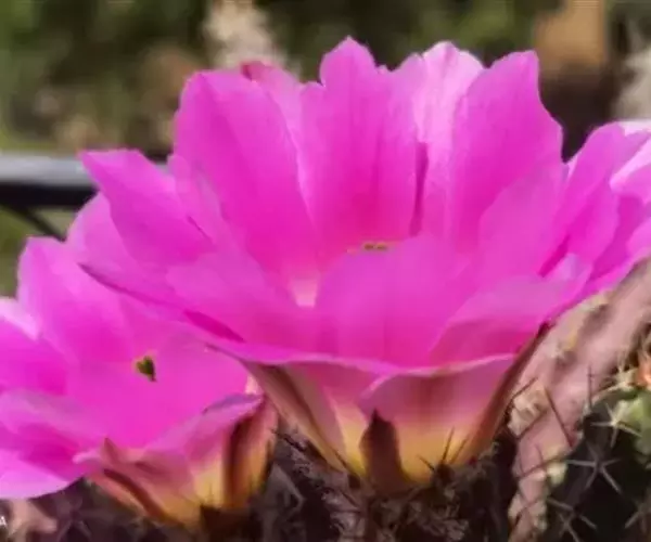 美花角植株大型,球状或筒状。具锐棱。刺硬而直,常扁平。刺色明快。刺座附毡毛,尤其在球顶部常有大块毡毛。钟状花顶生,黄或粉红。果实被稠毛。