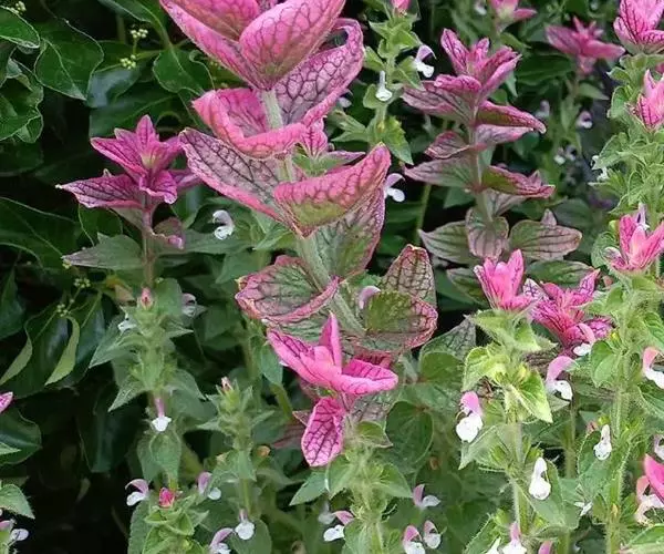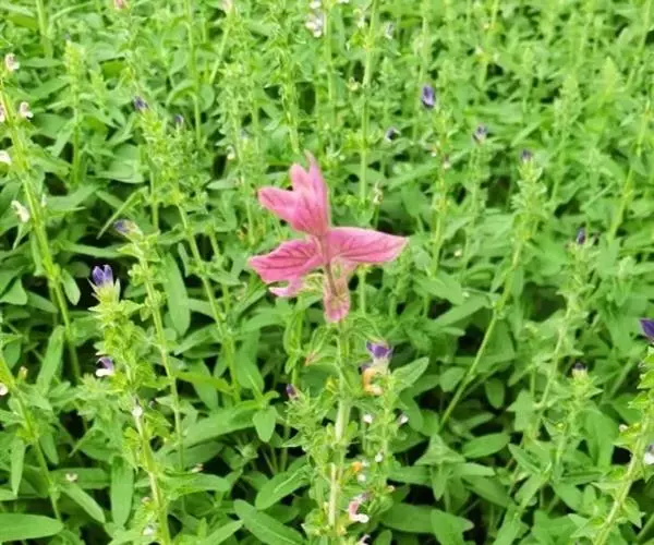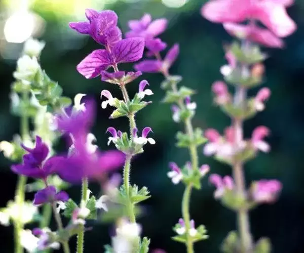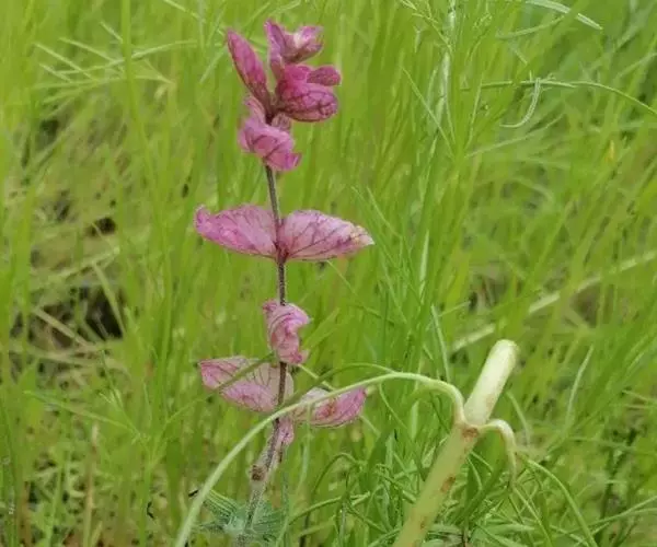 彩苞鼠尾草(Salvia viridis)为唇形科、鼠尾草属一年生草本,株型直立,叶对生长椭圆形,色灰绿,叶表有凹凸状织纹,有香味,及具观尝性与食用性;花朵有纸质苞片环绕,粉红至浅蓝花有深色条纹;花期夏季。花可拿来泡茶,散发清香味道,可消静体内油脂,帮助循环,具防腐、抗菌、止泻的效果,含雌激素,孕妇应避免使用。