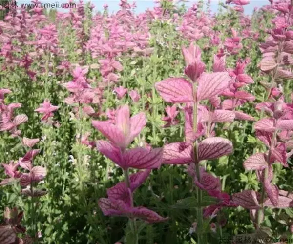 彩苞鼠尾草(Salvia viridis)为唇形科、鼠尾草属一年生草本,株型直立,叶对生长椭圆形,色灰绿,叶表有凹凸状织纹,有香味,及具观尝性与食用性;花朵有纸质苞片环绕,粉红至浅蓝花有深色条纹;花期夏季。