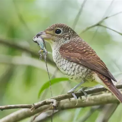 虎纹伯劳:全长165毫米左右。雄性成鸟:额基、眼先和宽阔的贯眼纹黑色;前额、头顶至后颈蓝灰色;上体余部包括肩羽及翅上覆羽栗红褐色,杂以黑色波状横斑;飞羽暗褐色,外翻具棕褐色羽缘;尾羽棕褐色,具不明显的褐色横斑,外侧尾羽端缘棕白色;下体纯白色,两胁略沾蓝灰色;覆腿羽白杂以黑斑。雌性成鸟羽色与雄鸟相似,但前额基部黑色较小,眼先及过眼黑纹沾褐,头顶灰色及背羽的栗褐色均不如雄鸟鲜艳;胁部缀以黑褐色鳞状横斑。一般栖息于树林、分布自平原至丘陵、山地,喜栖于疏林边缘以及巢址选在带荆棘的灌木及洋槐等阔叶树。性格凶猛,常停栖在固定场所,寻觅和抓捕猎物。主要食物是昆虫,特别是蝗虫、蟋蟀、甲虫、臭虫、蝴蝶和飞蛾,也吃小鸟和蜥蜴。分布于亚洲多国,该物种的模式产地在印度尼西亚爪哇。