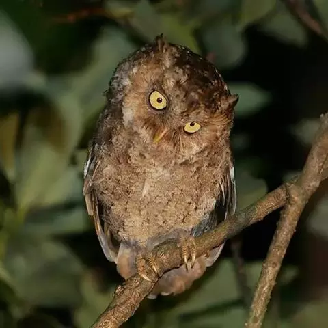 东方角鸮(学名:Otus sunia),是脊索动物门,鸟纲,鸮形目,鸱鸮科的一种鸟类。国家二级重点保护野生动物,CITES附录Ⅱ级。相貌十分符合公众对猫头鹰形象的印象,圆脸庞,大眼睛,还有一双直立的“耳朵”——其实那是耳孔附近生长的羽毛,据说有促进声波聚焦的功效。东方角鸮十分娇小,即使伸直脖子挺胸抬头也不过两个拳头叠起来这么高,而且浑圆的头部占了很大比例。