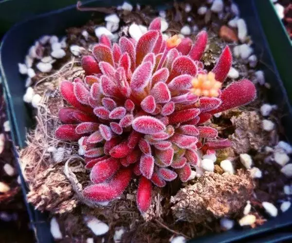 扁平,倒披针形或倒卵形,形状介于椭圆形和长方形之间。长1.5—3.5厘米,宽0.5—1.2厘米。长在植株的基部,向外延伸。有绒毛。朝上一面平坦或微凹,朝下一面凸起。边缘尖锐,有极微小的纤毛。基部呈楔形。有叶尖。一般呈棕红色或深紫红色,阳光充足、温差大的环境下呈现较鲜艳的红色,少光环境下呈绿色。