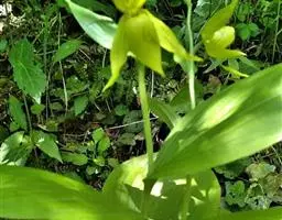 无苞杓兰(学名:Cypripedium bardolphianum W. W. Smith et Farrer):植株高8-12厘米,具细长而横走的根状茎。茎直立,较短,顶端具2枚叶。叶近对生,平展或斜立;叶片椭圆形。花序顶生,直立,具1花;花较小,通常萼片与花瓣淡绿色而有密集的褐色条纹,唇瓣金黄色;花瓣长圆状披针形,斜歪,长1.5-1.8厘米,宽5-6毫米,先端急尖,常多少围抱唇瓣,无毛;唇瓣囊状,腹背压扁。蒴果椭圆状长圆形,无毛,果期花序柄仍继续延长。花期6-7月,果期8月。