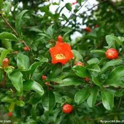 石榴(拉丁名:Punica granatum L.)落叶乔木或灌木;单叶,通常对生或簇生,无托叶。花顶生或近顶生,单生或几朵簇生或组成聚伞花序,近钟形,裂片5-9,花瓣5-9,多皱褶,覆瓦状排列;胚珠多数。浆果球形,顶端有宿存花萼裂片,果皮厚;种子多数,浆果近球形,果熟期9-10月。外种皮肉质半透明,多汁;内种皮革质。
