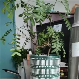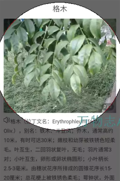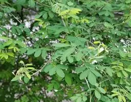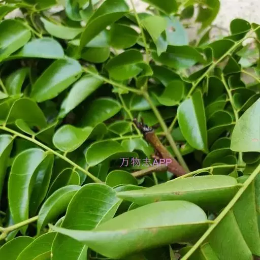 格木 乔木,通常高约10米,有时可达30米;嫩枝和幼芽被铁锈色短柔毛。叶互生,二回羽状复叶,无毛;羽片通常3对,对生或近对生,长20-30厘米,每羽片有小叶8-12片;小叶互生,卵形或卵状椭圆形,长5-8厘米,宽2.5-4厘米,先端渐尖,基部圆形,两侧不对称,边全缘;小叶柄长2.5-3毫米。