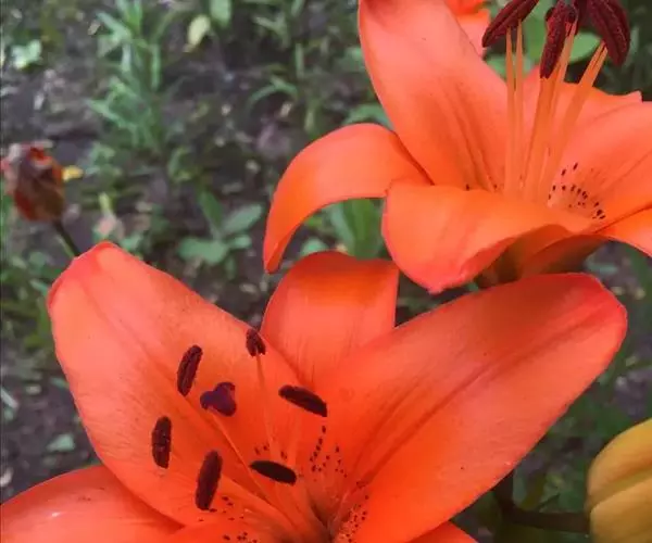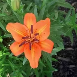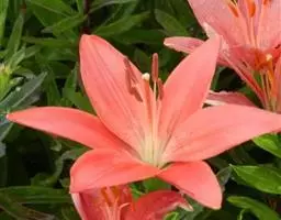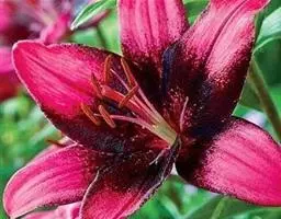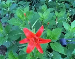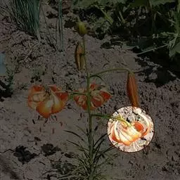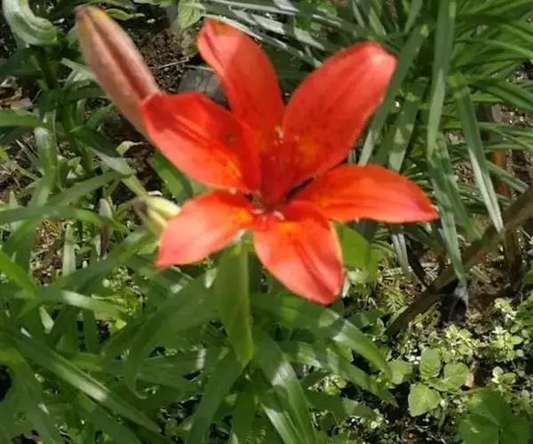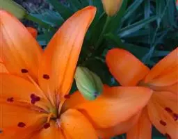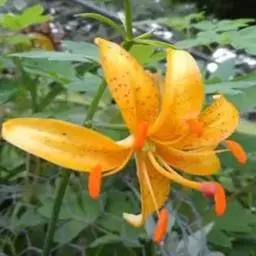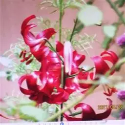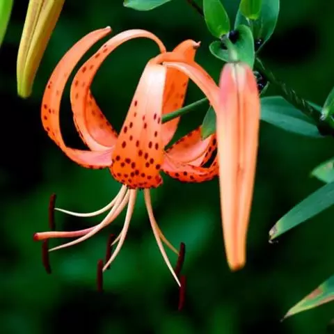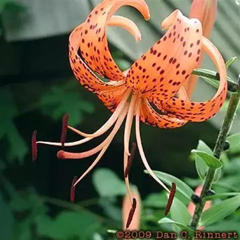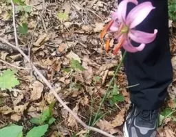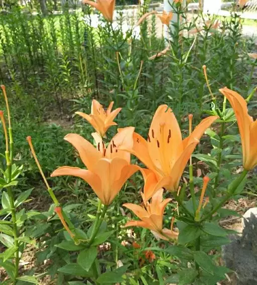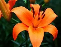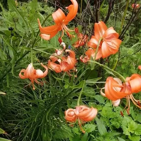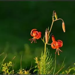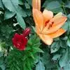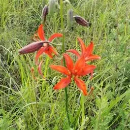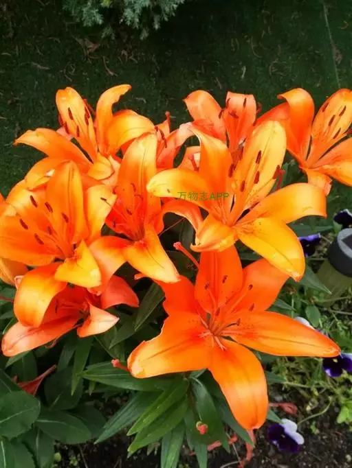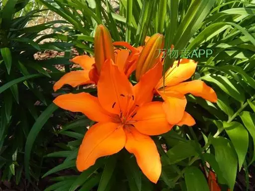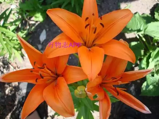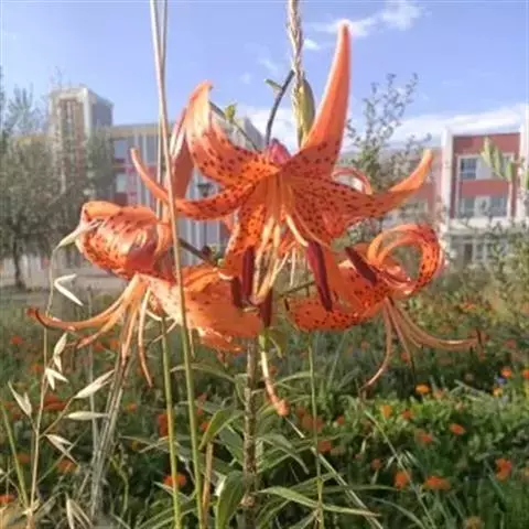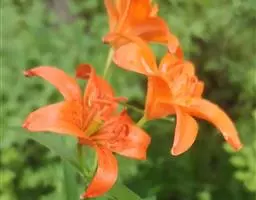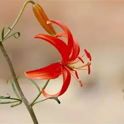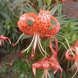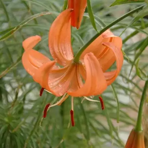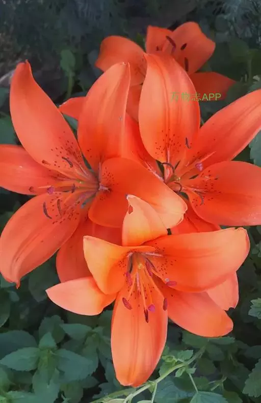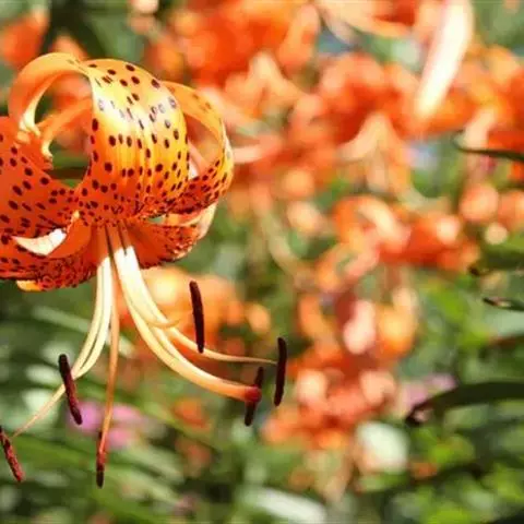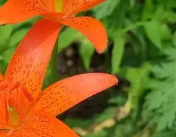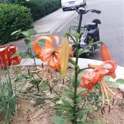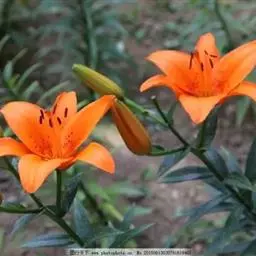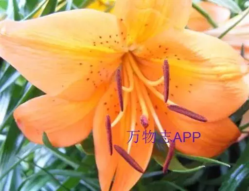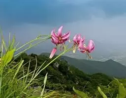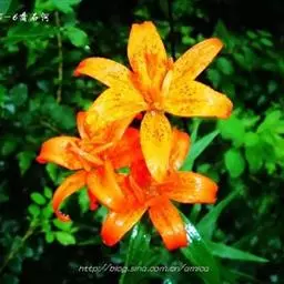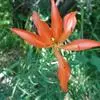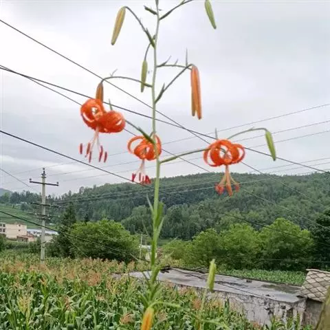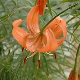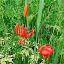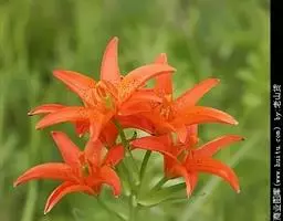 毛百合(学名:Lilium dauricum Ker Gawl.):鳞茎卵状球形,高约1.5厘米,直径约2厘米;鳞片宽披针形,长1-1.4厘米,宽5-6毫米,白色,有节或有的无节。茎高50-70厘米,有棱。叶散生,在茎顶端有4-5枚叶片轮生。花1-2朵顶生,橙红色或红色,有紫红色斑点;外轮花被片倒披针形,内轮花被片稍窄,蜜腺两边有深紫色的乳头状突起。蒴果矩圆形,长约4-5.5厘米,宽3厘米。花期6-7月,果期8-9月。