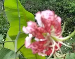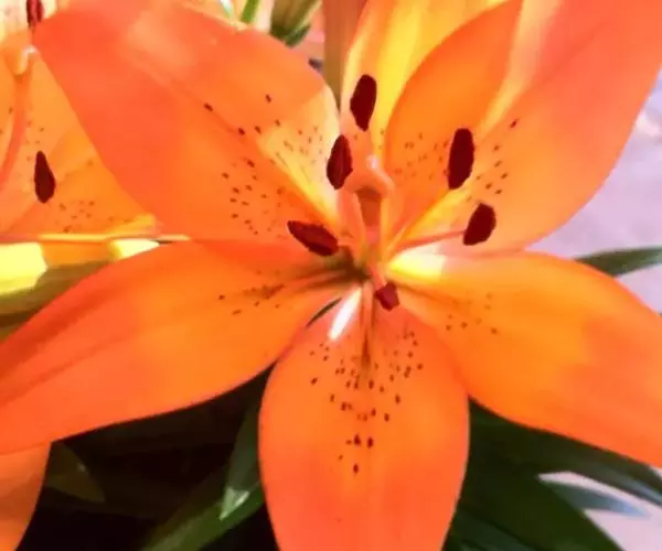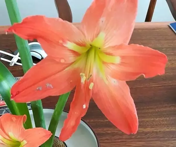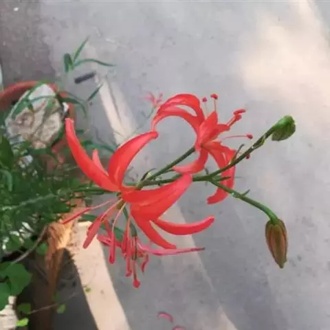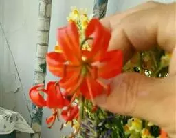 苞片叶状,长4厘米;花梗长(1-)2.5-8.5厘米,有白色绵毛;花1-2朵顶生,橙红色或红色,有紫红色斑点;外轮花被片倒披针形,先端渐尖,基部渐狭,长7-9厘米,宽1.5-2.3厘米,外面有白色绵毛;内轮花被片稍窄,蜜腺两边有深紫色的乳头状突起;雄蕊向中心靠拢;花丝长5-5.5厘米,无毛,花药长约1厘米;子房圆柱形,长约1.8厘米,宽2-3毫米;花柱长为子房的2倍以上,柱头膨大,3裂。
