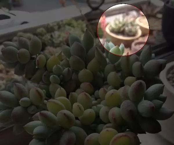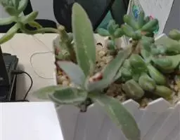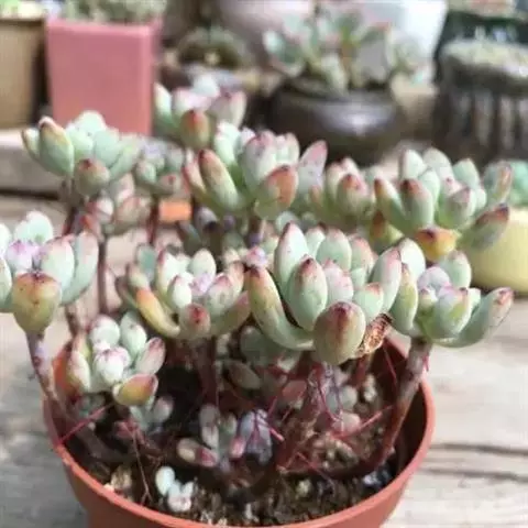 茎10厘米高,叶30-60枚,略扁的圆柱形,互生,淡绿至灰白色,被白粉。2-4厘米长 千代田之松 ,1.2、1.6厘米宽,0.9-1.2厘米厚,圆润,但尖端部分略有棱。花序30厘米高,小花懦红色。