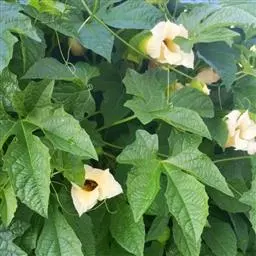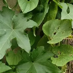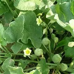 节瓜 一年生蔓生或架生草本;茎被黄褐色硬毛及长柔毛,有棱沟。叶柄粗壮,长5-20厘米,被黄褐色的硬毛和长柔毛;叶片肾状近圆形,宽15-30厘米,5-7浅裂或有时中裂,裂片宽三角形或卵形,先端急尖,边缘有小齿,基部深心形,弯缺张开,近圆形,深、宽均为2.5-3.5厘米,表面深绿色,稍粗糙,有疏柔毛,老后渐脱落,变近无毛;背面粗糙,灰白色,有粗硬毛,叶脉在叶背面稍隆起,密被毛。卷须2-3歧,被粗硬毛和长柔毛。