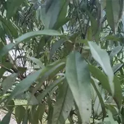 末级分枝常单生,枝环显著隆起,节间无毛而有光泽,枝上端具3-8叶;叶鞘起初疏生小刺毛,以后则无毛;叶耳和鞘口繸毛均无;叶舌高1毫米,上缘有细齿裂;叶片呈长圆状披针形,一般长10-25厘米,宽1.5-3厘米(但大型的可长达35厘米,宽7厘米),基部圆,先端细长渐尖,两表面均无毛,下表面近似有白粉,其色灰绿,次脉8-12对,小横脉在叶片下表面清晰可见。