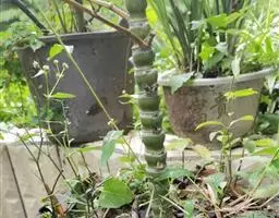 将分切好的种苗直立栽人口径约10厘米,高度约7厘米的小瓦盆中,素土填实。然后按15厘米x20厘米的株行距,连同小盆一起,栽植在苗畦中,使盆面与土面平齐,然后灌水,栽好之后,由于种苗根部被小盆匡束住,不能正常生长。于夏、秋二季抽生出的竹秆即长得极度矮小,高不盈尺,适于盆栽观赏的小型化竹株;第二年春天,就可做盆景用竹了。