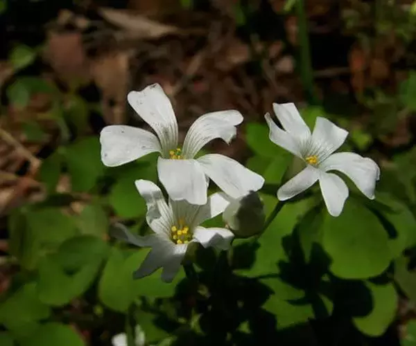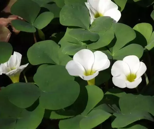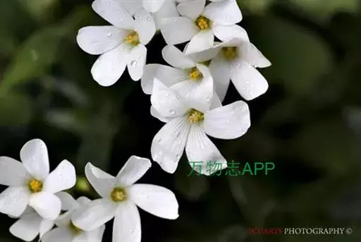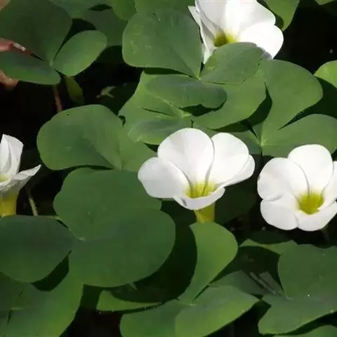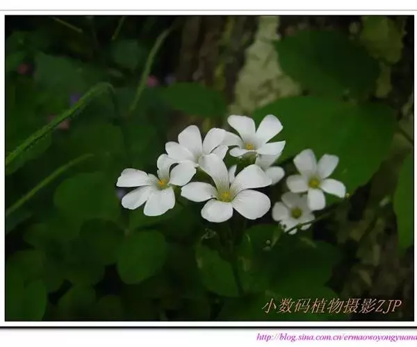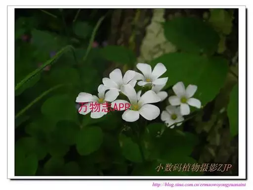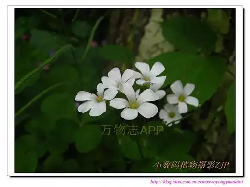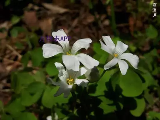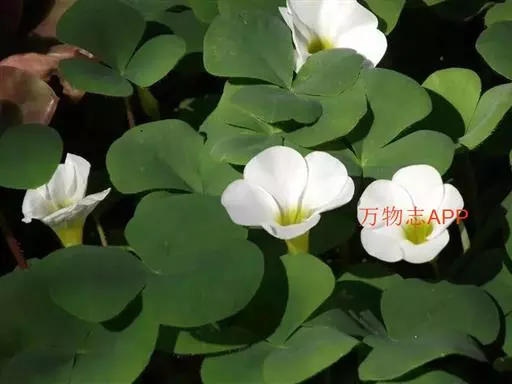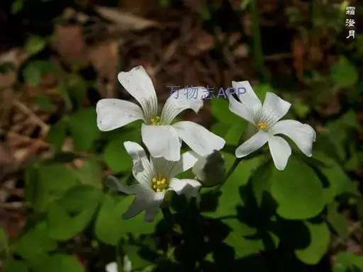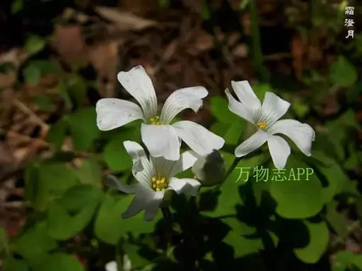 白花酢浆草(学名:Oxalis acetosella Linn.):又名山酢浆草,是酢浆草科酢浆草属的多年生草本植物,具有匍匐的根茎;小叶3,倒心形;花通常白色,单生。