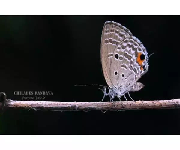 曲纹紫灰蝶(学名:Chilades pandava )是鳞翅目灰蝶科昆虫。成虫体长10-12毫米,翅展20-35毫米,翅面紫蓝色,前翅外缘黑色,后翅外缘有细的黑白边。翅反面灰褐色,缘毛褐色,两翅均具黑边。后翅有2条带内侧有新月纹白边,翅茎有3个黑斑,都有白圈。尾突细长,端部白色。