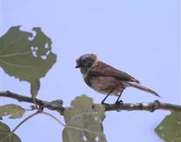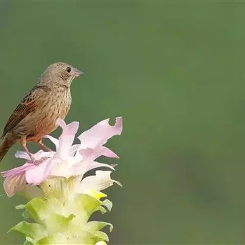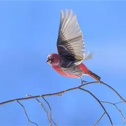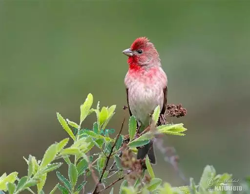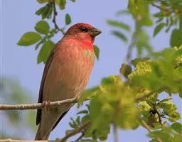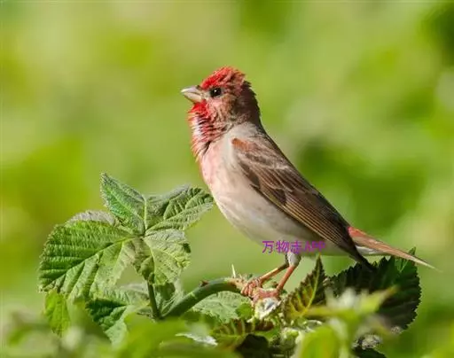 红腰朱雀:体长12-14厘米,小型鸟类。雄鸟前额和眉纹玫瑰粉红色,头顶和一宽的贯眼带深红褐色,背红…