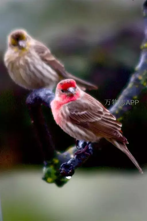 红眉朱雀:体长15厘米,是一种中等体型的朱雀。上体褐色斑驳,眉纹、脸颊、胸及腰淡紫粉,臀近白。…