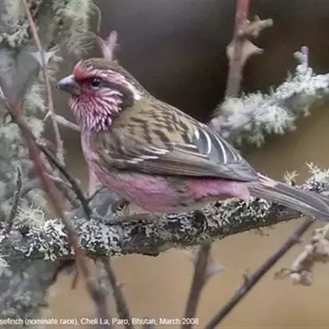 喜马拉雅白眉朱雀:小型鸟类,体长15-17厘米,体重24-35克。额基、眼先深红色,…
