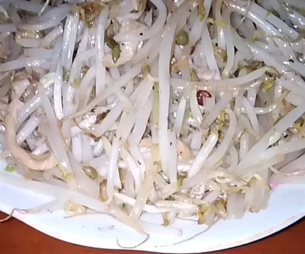⒊取一大盘,将豆芽倒入盘中,加盐、味精、醋、香油拌匀即成。