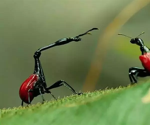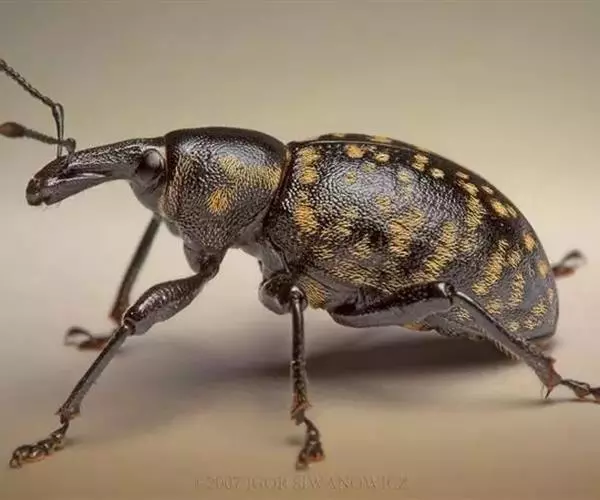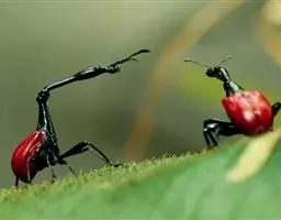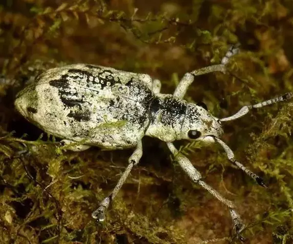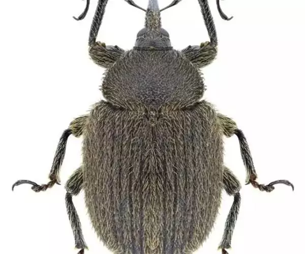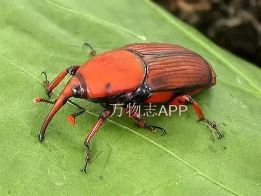 甘薯小象虫属鞘翅目,蚁象虫科。成虫体长5~8毫米,体形细长如蚁。全体除 触角 末节、前胸和 足呈桔红色外,其余均为蓝黑色而有金属光泽。头部延伸成细长的喙,状如象鼻,咀嚼式口器着生于喙的末端。膝状触角10节,雄虫触角末节成棍棒状,雌虫则成长卵状。前胸长为宽的2倍,在后部1/3处缩入如颈状。两鞘翅合起来呈长卵形,显著隆起。鞘翅表面具不明显的小刻点。足细长。卵椭圆形,长约0.6毫米,初产时乳白色,后变淡黄色,表面有小刻点。