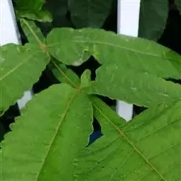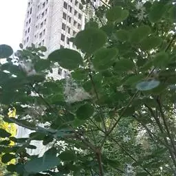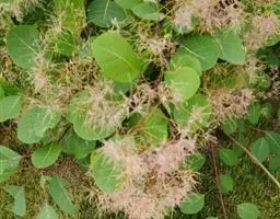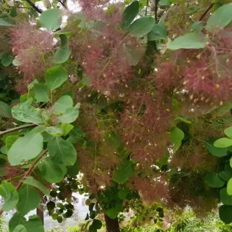 粉背黄栌叶卵圆形,较大,长3.5-10厘米,宽2.5-7.5厘米,无毛,但叶背显著被白粉;叶柄较长,…