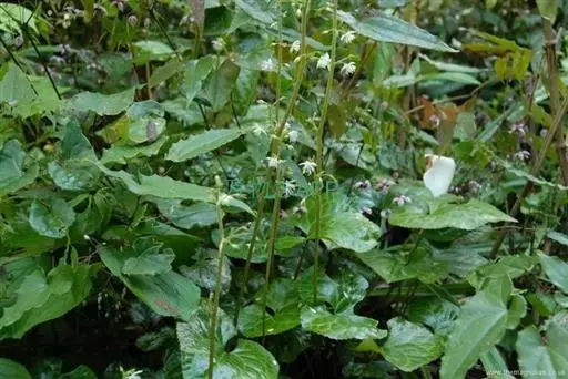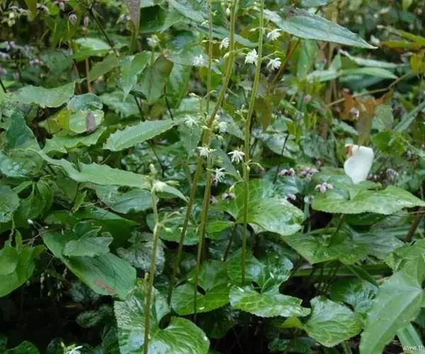 根状茎斜,长约达10厘米,粗3~7毫米。花葶高(14~)30~58厘米,有少数纵沟,下部无毛,上部花序处密被开展的短柔毛。叶2~4,长(7~)18~35厘米;叶片肾形,心形或心状卵形,长(1.5~)4.5~9.5厘米,宽(1.8~)5.5~16厘米,顶端圆形,短渐尖或急尖,基部深心形,边缘密生圆锯齿(锯齿顶端具短尖),两面无毛,稀在背面沿脉被短柔毛;叶柄长(5.5~)10~26厘米,具纵沟,基部稍变宽,无毛。花序长为花葶长度的1/6~1/4,宽1.5~2.5厘米;苞片通常钻形,有时披针形,间或匙形,长1~5毫米,无毛;花梗长5~10毫米,密被伸展的短柔毛;萼片白色或带粉红色,狭卵形或椭圆形,长3~5(~6~8)毫米,宽1.8~2.5(~3)毫米,顶端急尖或钝,无毛;雄蕊比萼片稍短,花药直径约0.3毫米;心皮长2.5~3.5毫米,基部疏被短柔毛。蓇葖长1.1~1.7厘米,扁,披针状线形,中部稍弯曲,下部宽3~4毫米,在近基部处疏被短柔毛,其余无毛,约有8条斜横脉,喙长1~2毫米;种子长约2.5毫米,种皮具斜的纵皱褶。5~8月开花。