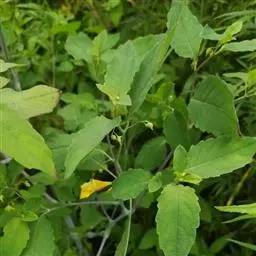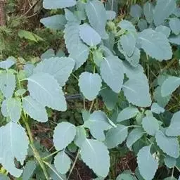 叶互生,在下部有叶柄,在上部无叶柄,叶片卵形或卵圆形,长2-7厘米,宽1.5-5厘米,顶部钝,基圆、截平或心形,边缘波形或钝圆齿,上表面灰绿色,下表面淡绿色,侧脉6-7对。