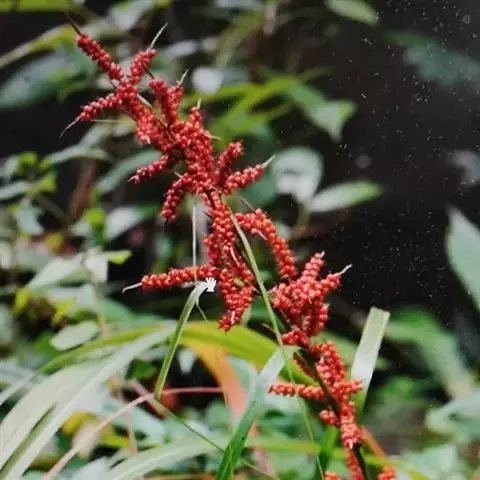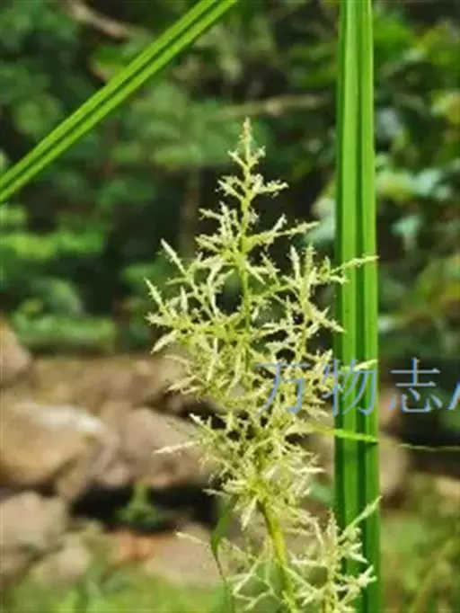 圆锥花序复出,长20-40厘米;支圆锥花序数个,通常单生,少有双生,轮廓为卵状三角形,长4-15厘米,宽3-6厘米,支花序柄坚挺,钝三棱形,最下部1个长10-18厘米,向上部的渐短,平滑;支花序轴锐三棱形,密生短粗毛;小苞片鳞片状,长约1.5毫米,背面被短粗毛;枝先出叶囊状、内无花,背面有数脉,被短粗毛。小穗极多数,全部从枝先出叶中生出,横展,长5-12毫米,两性,雄雌顺序;雄花部分与雌花部分近等长。