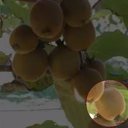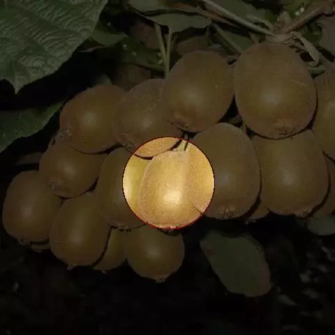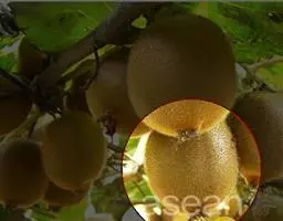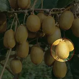 黄金果猕猴桃 黄金果是猕猴桃品种之一,原产地新西兰,因成熟后果肉为黄色而得名。黄金果为二倍体,果实为长卵圆形,果喙端尖、具喙,果实中等大小,单果重80~140g,若使用生物促进剂BenifitPZ,大果比例增加。软熟果肉黄色至金黄色,味甜具芳香,肉质细嫩,风味浓郁,可溶性固形物含量15%~19%,干物质含量17%~20%,果实硬度1.2~1.4kg/cm。